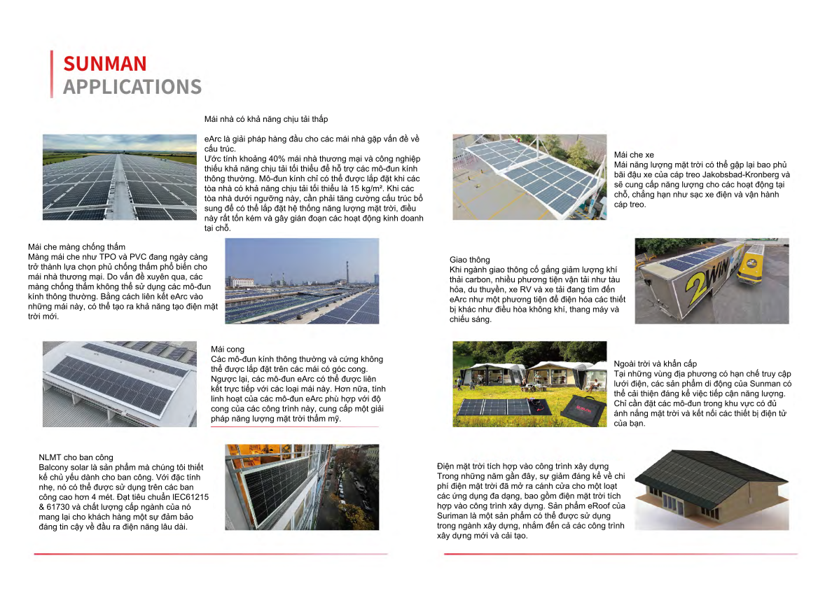 Sunman coi eArc là công nghệ hỗ trợ cốt lõi sẽ mở rộng thị trường và triển khai năng lượng mặt trời. Hiện tại, eArc giải quyết một số thị trường mà mô-đun kính chưa đáp ứng được, bao gồm mái C&L nhẹ, mái màng chống thấm, quang điện tích hợp trên xe và năng lượng không nối lưới. Hơn nữa, eArc đang mở đường cho những cải tiến mới, tạo đà cho các ứng dụng xuyên thị trường như vật liệu xây dựng và robot.