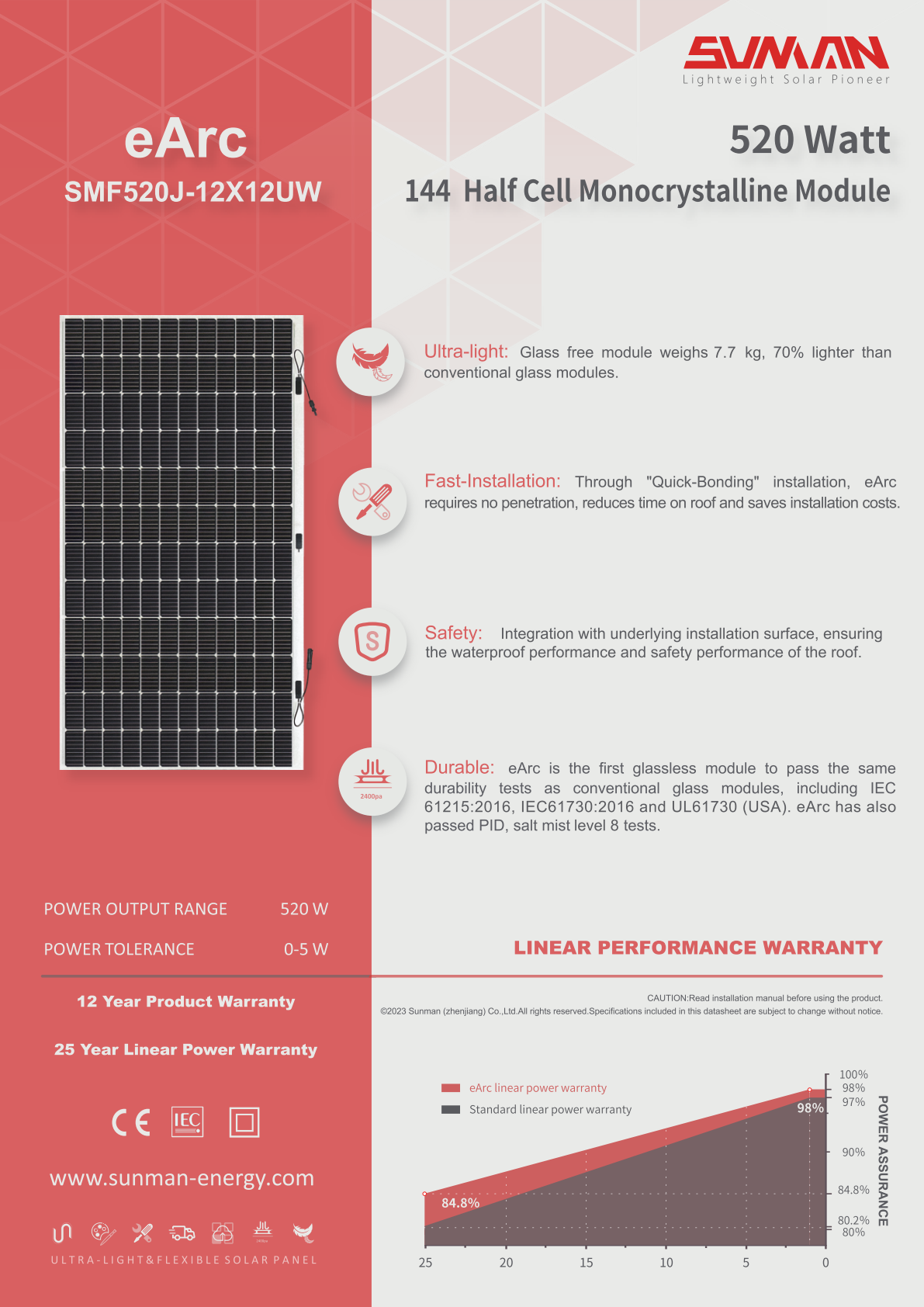 eArc là mô-đun năng lượng mặt trời không kính đầu tiên trên thế giới. Là một cải tiến kết hợp pin mặt trời silicon tinh thể đã được chứng minh với vật liệu composite được cấp bằng sáng chế của Sunman, eArc có cùng độ bền và độ chắc chắn của các mô-đun thủy tinh thông thường. Tuy nhiên, không giống như kính: eArc giống như một tấm pin mặt trời linh hoạt", nhẹ hơn 70% và mỏng hơn tới 95%. eArc yêu cầu thiết bị xuyên thấu hoặc lắp đặt bằng 0 trong quá trình lắp đặt, cắt giảm 40% thời gian tại chỗ. eArc dễ vận chuyển hơn với số lượng lớn - tăng thêm tới 60% kW trên mỗi pallet cho nhiều ứng dụng mô-đun kính không thể phục vụ.