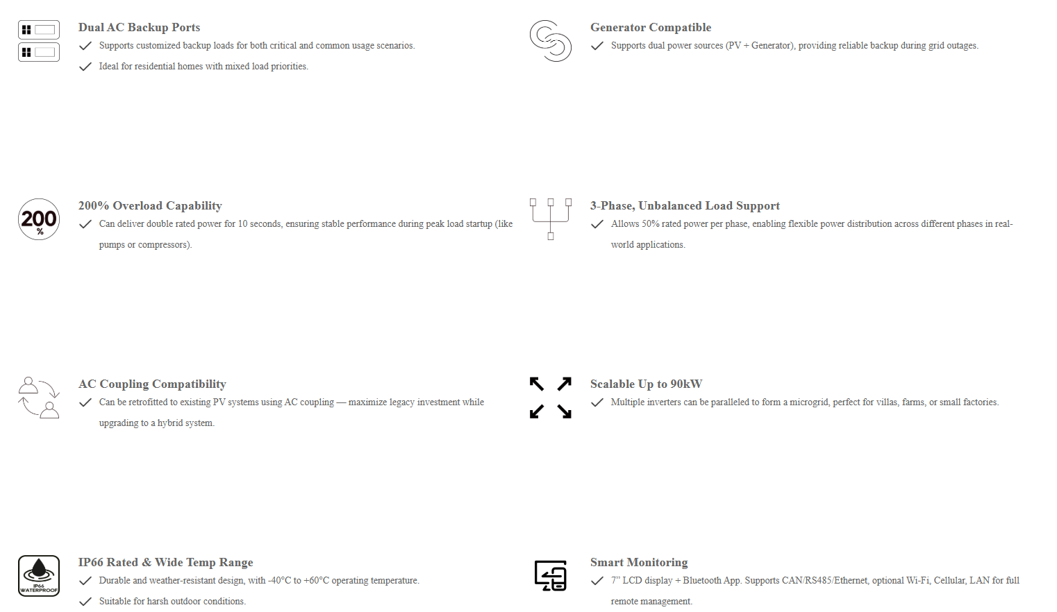 Pytes JS Series Hybrid Inverter is a powerful 3-phase solar inverter designed for flexible and resilient energy storage systems.Available in 10kW, 12kW, and 15kW models, it supports both on-grid and off-grid operations with seamless backup switching in under 10ms. Featuring up to 200% overload capacity and smart load management, it’s ideal for households, small businesses, or microgrids.